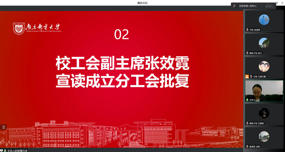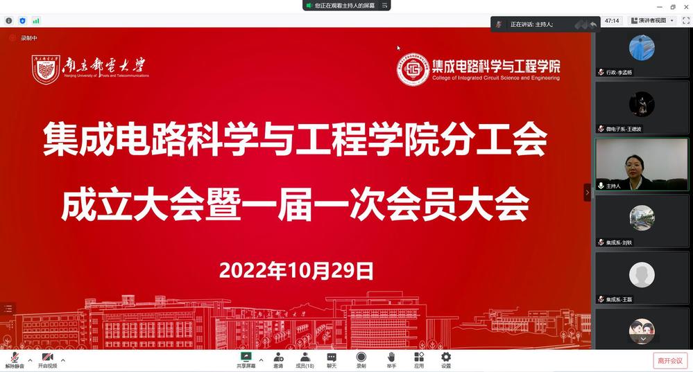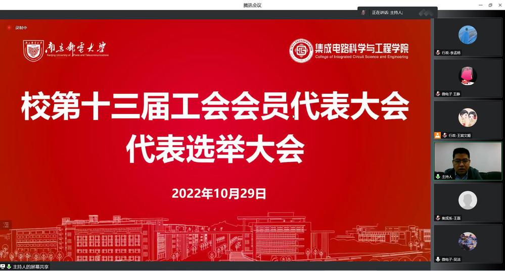 10月29日,集成电路科学与工程学院通过线上形式成功召开分工会成立大会暨一届一次会员大会,校第七届教职工代表大会代表和校第十三届工会会员代表大会代表选举大会。校工会副主席张效霓出席,学院全体教师参加本次会议,大会由院党委书记高翔和院党委副书记乔祖琴分别主持。
