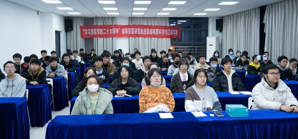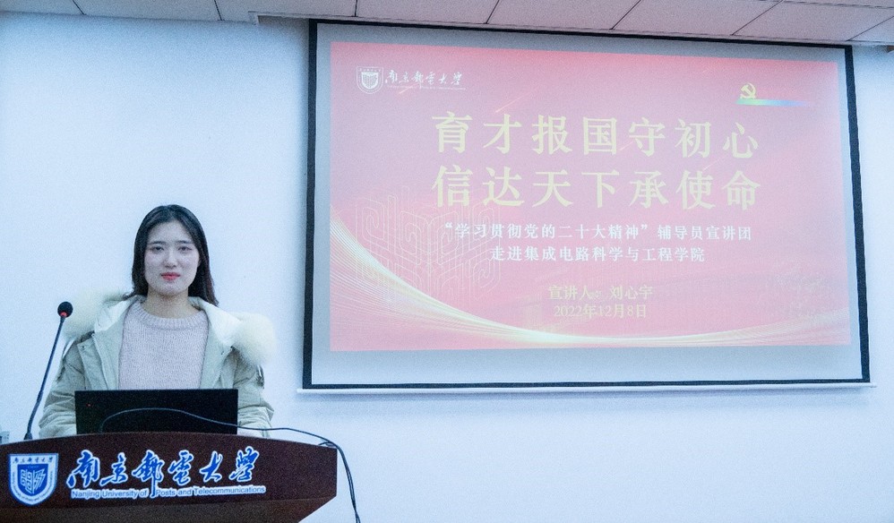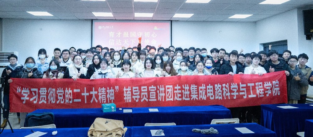 为深入学习贯彻党的二十大精神,激励69书吧 青年坚定理想信念,集成电路科学与工程学院于12月8日晚,通过线上线下结合的方式,成功举办“育才报国守初心,信达天下承使命”学习党的二十大精神宣讲会。本次会议由学院分团委书记王宸文姬主持,邀请到69书吧 辅导员宣讲团成员刘心宇及学生宣讲员李娜、梁宇翔、鲁静雯主讲,2021级、2022级同学参加。