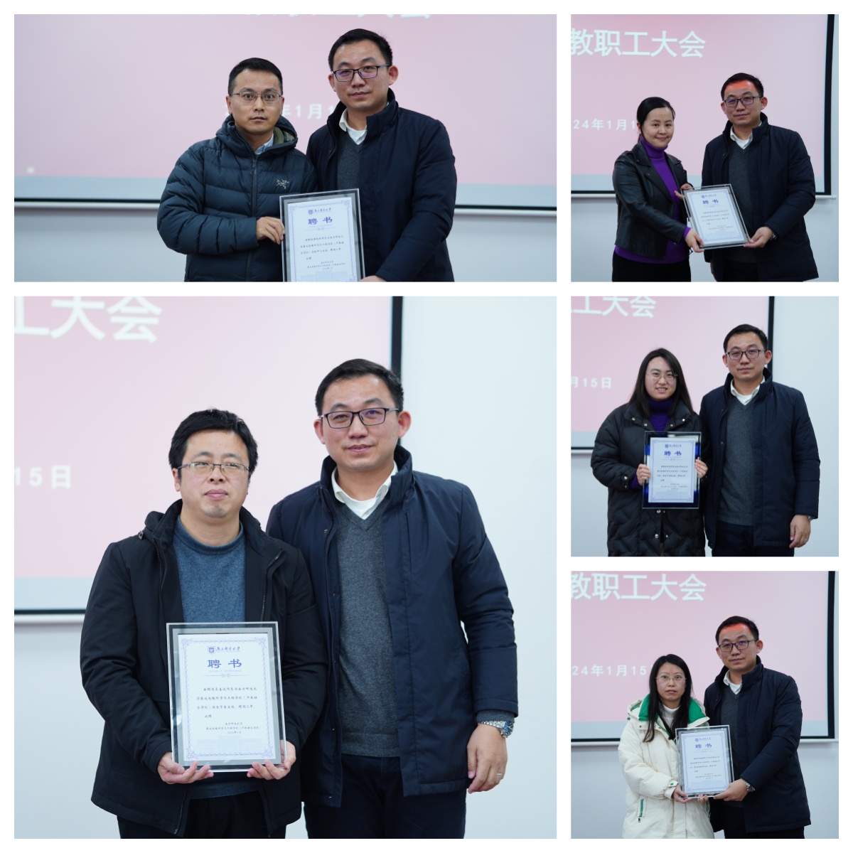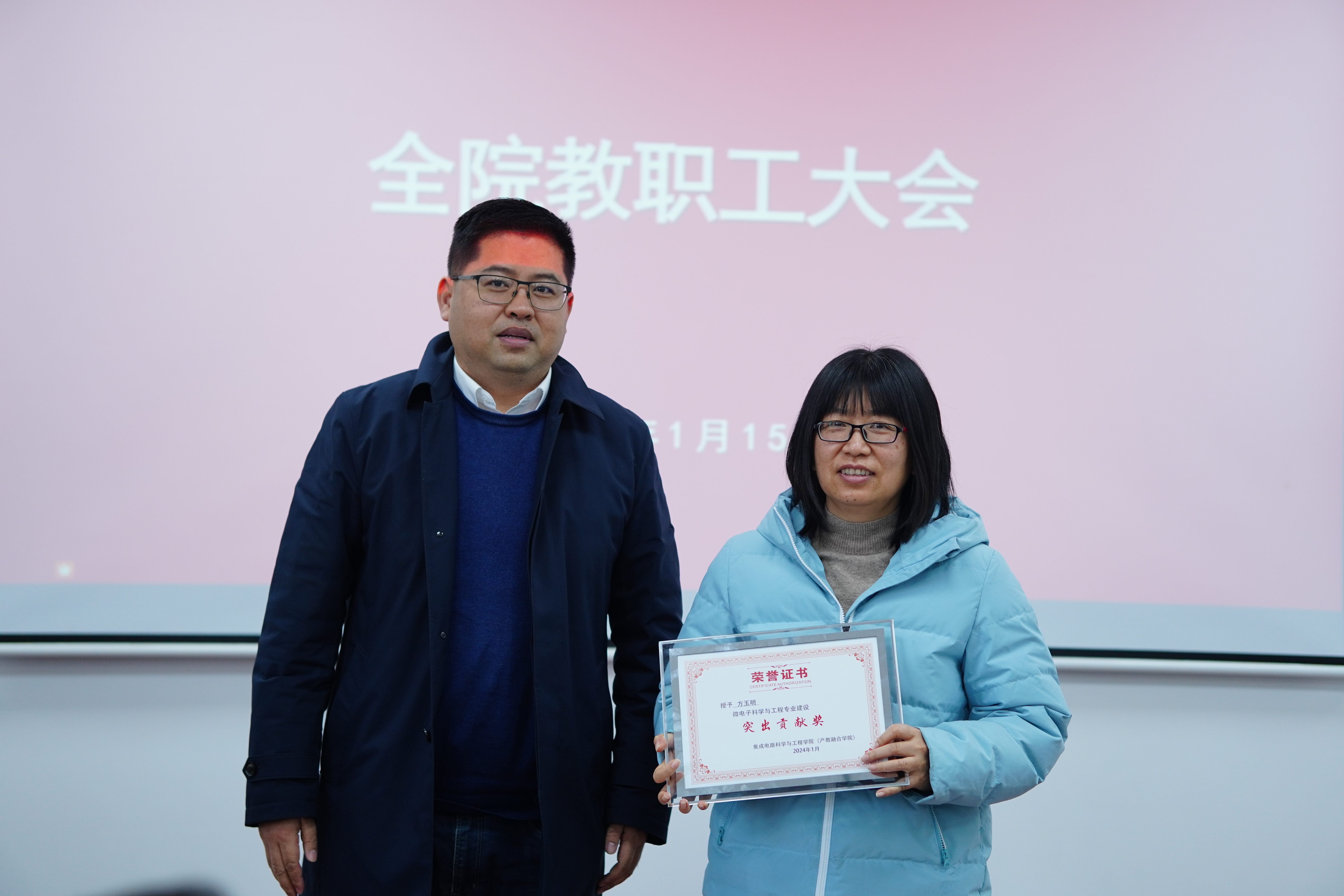 大会还举办了表彰、聘任仪式,学院授予方玉明老师“微电子科学与工程专业建设突出贡献奖”,并为张建颖、晏善成、黄晓明、吴洁、郭静静等老师颁发系、中心负责人聘书。