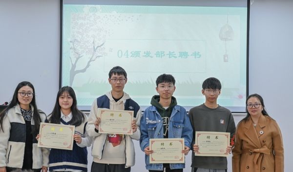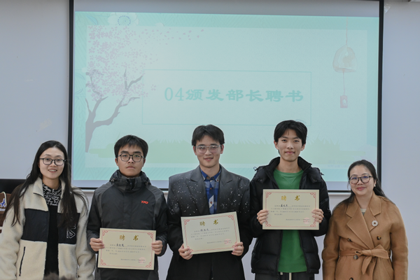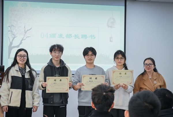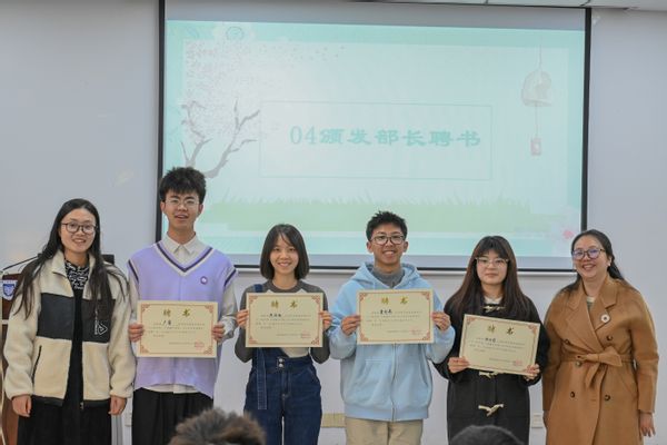 乔祖琴副书记与王宸文姬老师为各部门部长颁发聘书,共同见证第一届部长团的任职仪式。