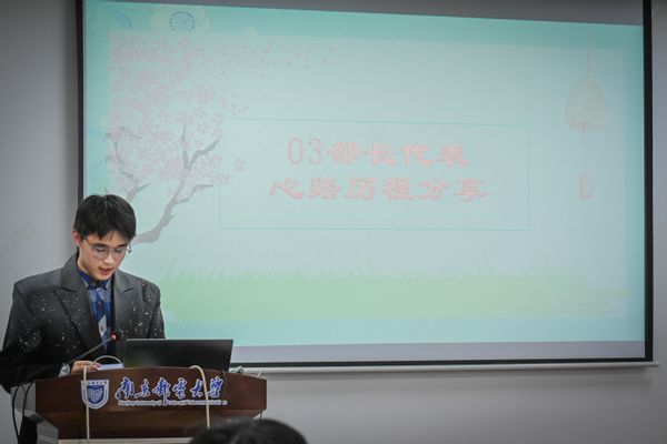 部长团代表徐浩天同学从自身经历出发,为大家分享了分心协从无到有的全过程,也向大家分享了分心协曾经举办过的一些有趣的活动,如心理短视频大赛、“芯”灵奇旅游园会等。他向大家阐述了大学生心理健康的重要性,呼吁大家积极参与社团活动,发展自身的同时也能够帮助他人。