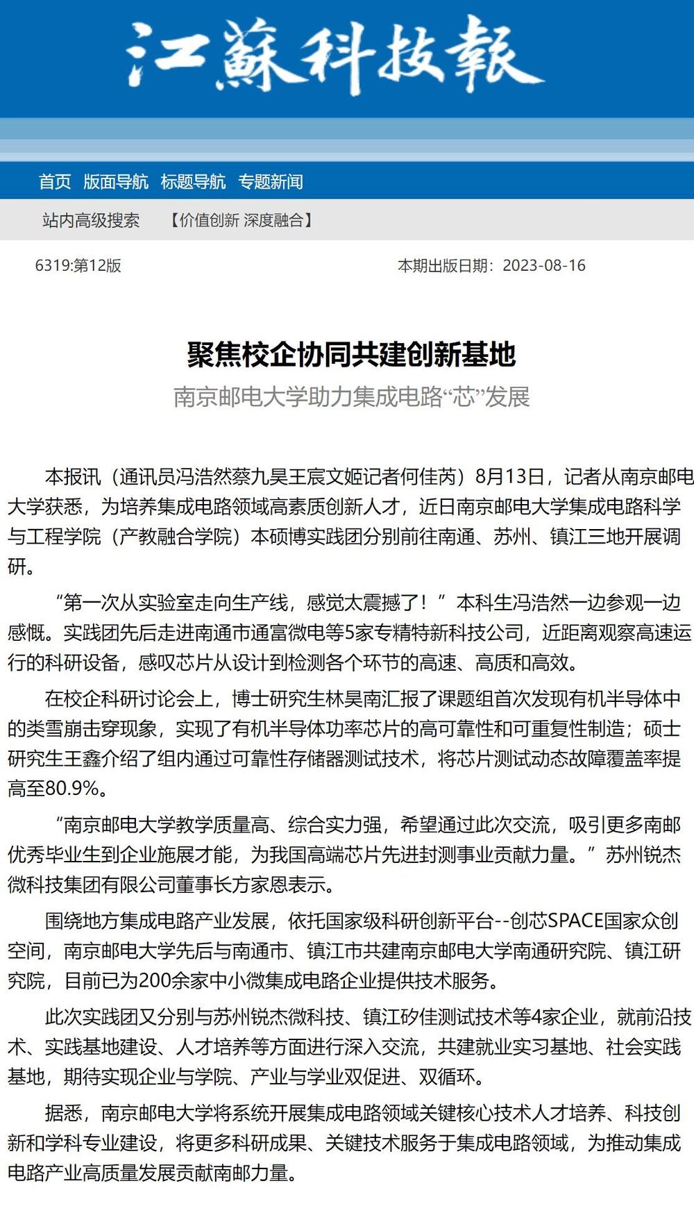 【江苏科技报】聚焦校企协同共建创新基地 69书吧 助力集成电路“芯”发展