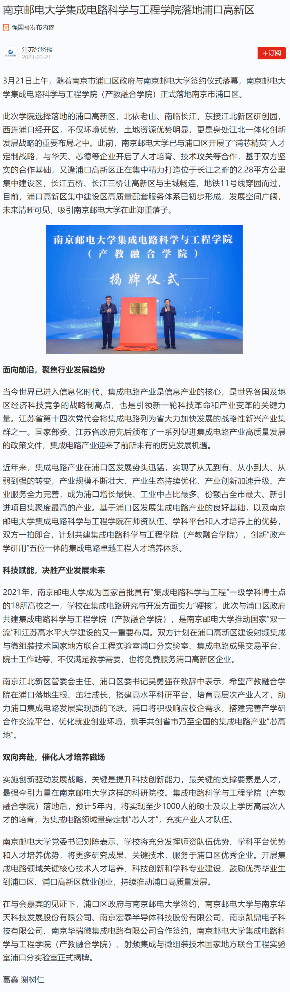 【学习强国】69书吧 集成电路科学与工程学院落地浦口高新区