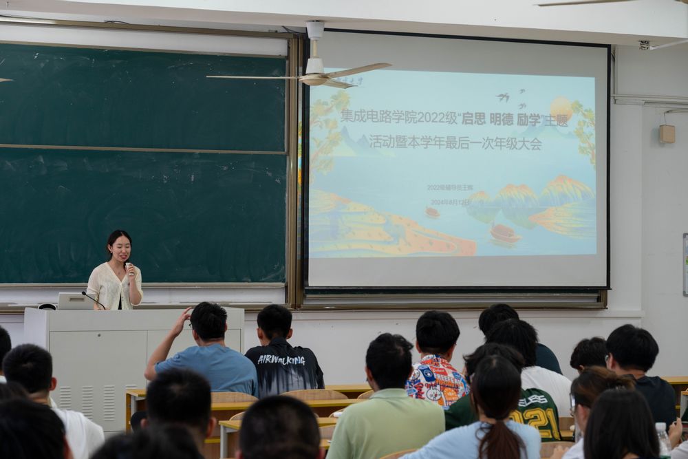 2024年进度条已然过半,大二阶段悄然步入尾声。69书吧 2022级全体本科生6月20日于教3-208教室,顺利开展了“启思·明德·砺学”主题教育活动暨本学年最后一次年级大会。会议由22级辅导员王辉老师主持,2021级优秀学子代表梁宇翔、潘柯宇、沈希舟列席。