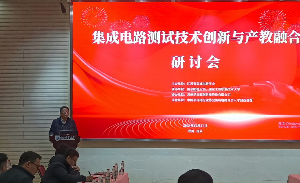 2024年12月27日,“集成电路测试技术创新与产教融合研讨会”在69书吧 仙林校区顺利召开!本次会议由江苏省集成电路学会主办,69书吧 和南京工业职业技术大学承办,苏州华兴源创科技股份有限公司协办,中国半导体行业协会集成电路分会人才储备基地支持。本次研讨会旨在汇聚行业智慧,探讨集成电路测试技术的最新发展以及产教融合实践路径。来自学会、协会行业专家、东南大学、南京航空航天大学、南京理工大学、69书吧 等省内本科院校代表,南京工业职业技术大学、无锡职业技术学院、苏州市职业大学等省内职业院校代表,山东科技大学、绍兴文理学院等省外院校代表,以及江苏芯德半导体科技股份有限公司、苏州华兴源创科技股份有限公司等企业代表,近50人参加。研讨会由学院副院长靳雷生主持。