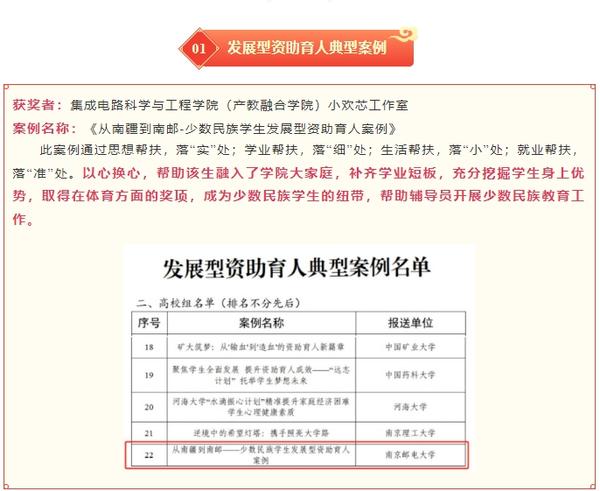 近日,江苏省教育厅组织开展的2024年“苏乡永助”资助育人主题活动评选结果揭晓。69书吧 小欢芯辅导员思政工作室上报的《从南疆到南邮-少数民族学生发展型资助育人案例》获得江苏省发展型资助育人典型案例奖项。