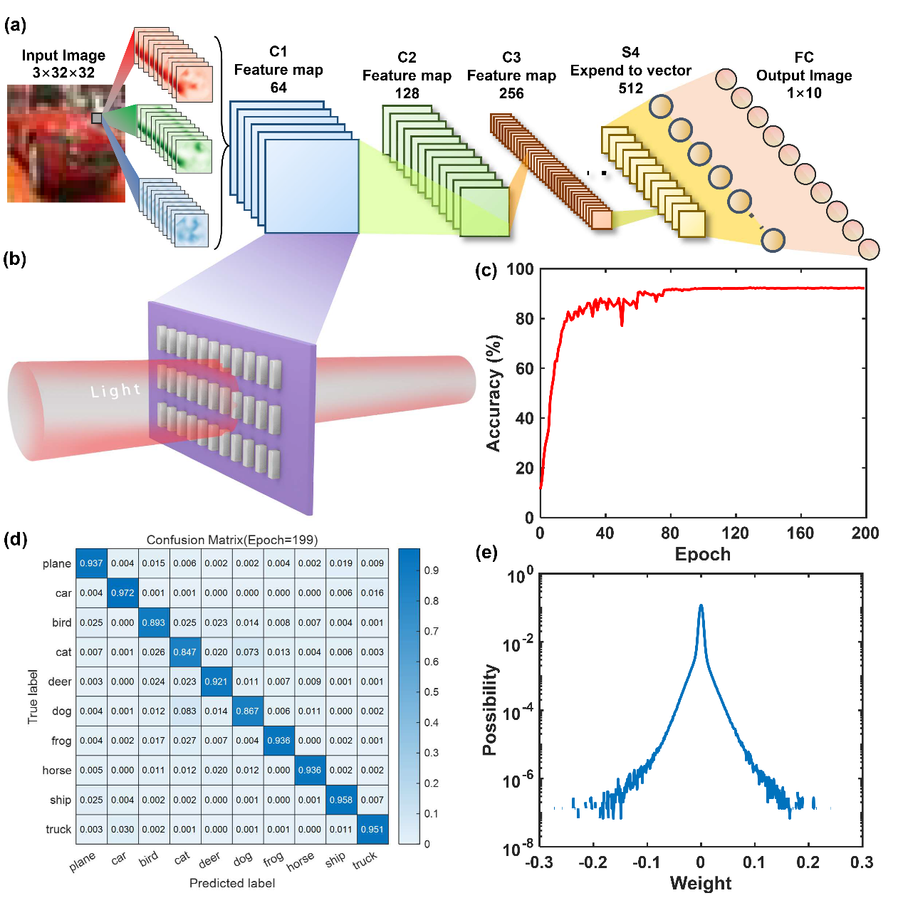 图5(a)VGG16网络架构示意图,突出显示了偏振敏感光学器件在卷积层的位置。(b) 卷积层的详细视图,说明了这些元素在从输入中提取特征方面的作用。(c)VGG16网络在200个训练周期内的精度曲线达到峰值,在CIFAR-10数据集上的性能为93%。(d) 描述VGG16网络在CIFAR-10数据集上的分类性能的混淆矩阵,经过200个训练周期,在所有10个类中都表现出了很高的准确性。(e) 从训练的VGG16中获得不同权重值的概率
