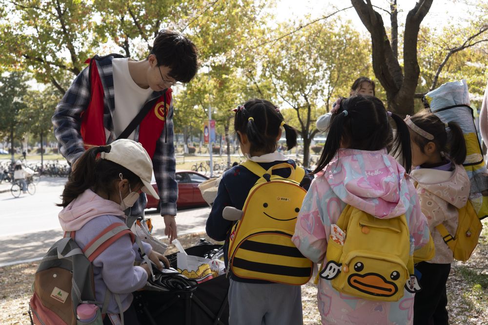 赏花结束后,孩子们在志愿者们的陪伴下前往草坪露营区。草坪上回荡着清脆的笑声,集成电路学院的“大朋友”们或弯腰牵住孩子的手奔跑,或蹲地帮忙整理松开的鞋带,细致入微的照顾让小朋友们感受到浓浓的爱意。