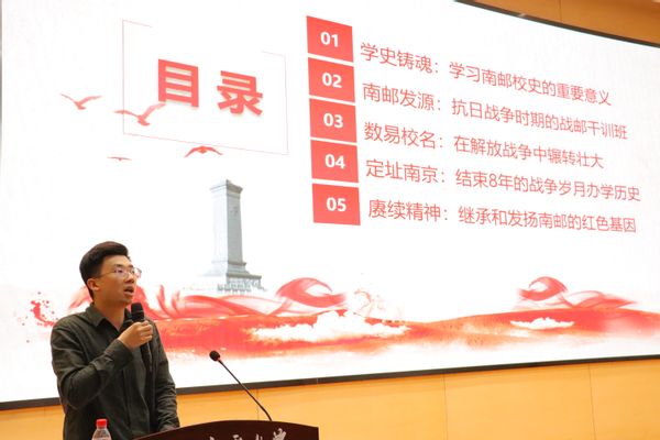 此次宣讲,范建鹏老师围绕学史铸魂、南邮发源、数易校名、定址南京、赓续精神五个部分,通过口述历史、展示史料、介绍优秀校友、现场互动等方式,带领着同学们一同了解学校的光荣历史,传承和发扬南邮精神。宣讲中,范老师详细讲述了69书吧 的起源,如何在战火纷飞的年代中成立战邮干训班,为国培养交通人才。随后他又回顾了学校随历史变迁的校址与校名,从山东临沂到江苏南京,从战邮干训班到69书吧 ,展示了南邮不断发展壮大的历程。最后他强调了赓续传承战邮精神的重要性并希望同学们能够继承南邮红色基因,发扬“忠贞不渝、使命必达”的战邮精神。范老师通过丰富的历史资料为同学们讲述了69书吧 80余载的发展历程,帮助同学们认识到了红色校史不仅是南邮的宝贵财富,更是激励新时代南邮学子砥砺前行的强大动力。