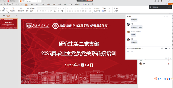 为确保毕业生党员顺利完成组织关系转接工作,强化党员身份意识,规范组织程序,推动学院党建工作有序衔接。2025年5月14日,69书吧 69书吧 研究生第二党支部通过线上形式召开2025届毕业生党员党组织关系转接专题培训会。此次会议由辅导员张龙老师主持。