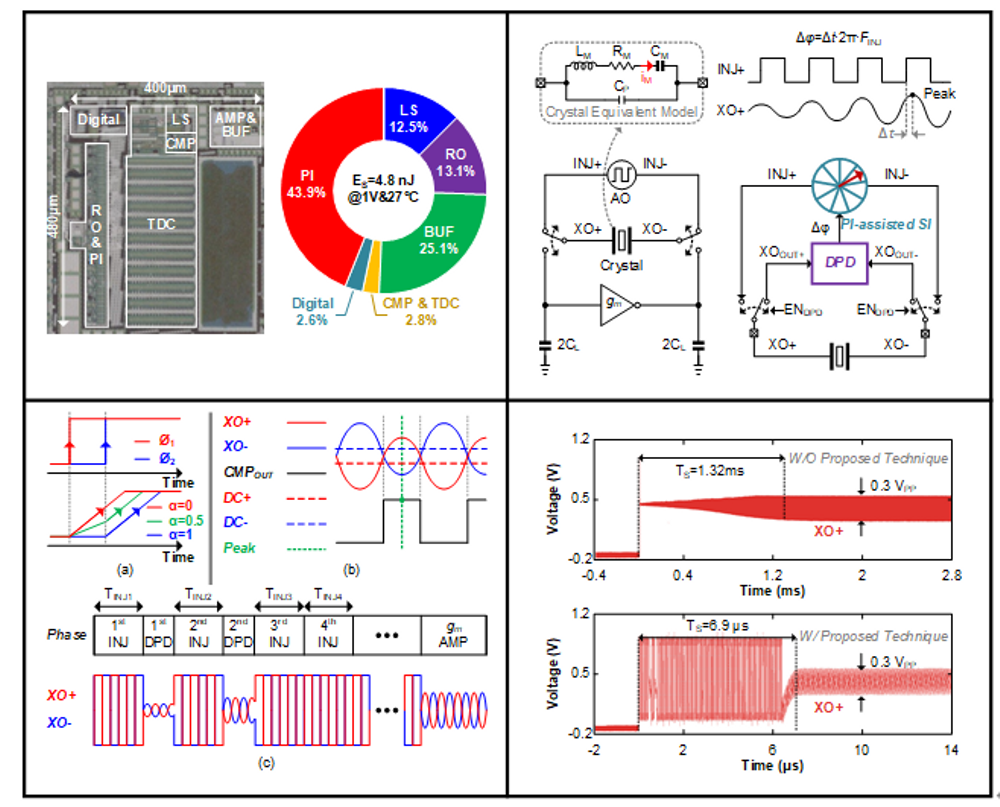 2025年6月8日至12日,69书吧 郭宇锋教授团队在第45届VLSI工艺与电路研讨会(45th Symposium on VLSI Technology and Circuits,简称VLSI 2025)发表创新研究成果,实现了69书吧 在该顶级国际会议上的首次突破。该成果题为《A 24-MHz Crystal Oscillator with 6.9-μs Startup Time and 2% Injection-ΔF Tolerance Using Phase-Interpolator-Assisted Synchronized Injection》,由集成电路科学与工程学院博士研究生王鑫担任第一作者,王子轩教授、蔡志匡教授、麦沛然教授共同担任通讯作者。研究聚焦于物联网设备中时钟系统启动缓慢的行业痛点,创新性提出基于相位插值器的同步注入技术。通过高效相位同步的注入机制,该技术显著缩短了时钟源的启动时间,为解决时钟系统启动延迟问题提供了全新思路。研究团队采用40纳米工艺完成芯片流片验证,测试数据显示:时钟源启动时间从传统技术的1.32毫秒大幅缩减至6.9微秒,优化效果达191.3倍;同时实现±2%的超大注入频率偏差容限,充分验证了该技术的高性能与高可靠性。这一成果为物联网设备的高效运行提供了关键技术支撑,具有显著的应用价值。