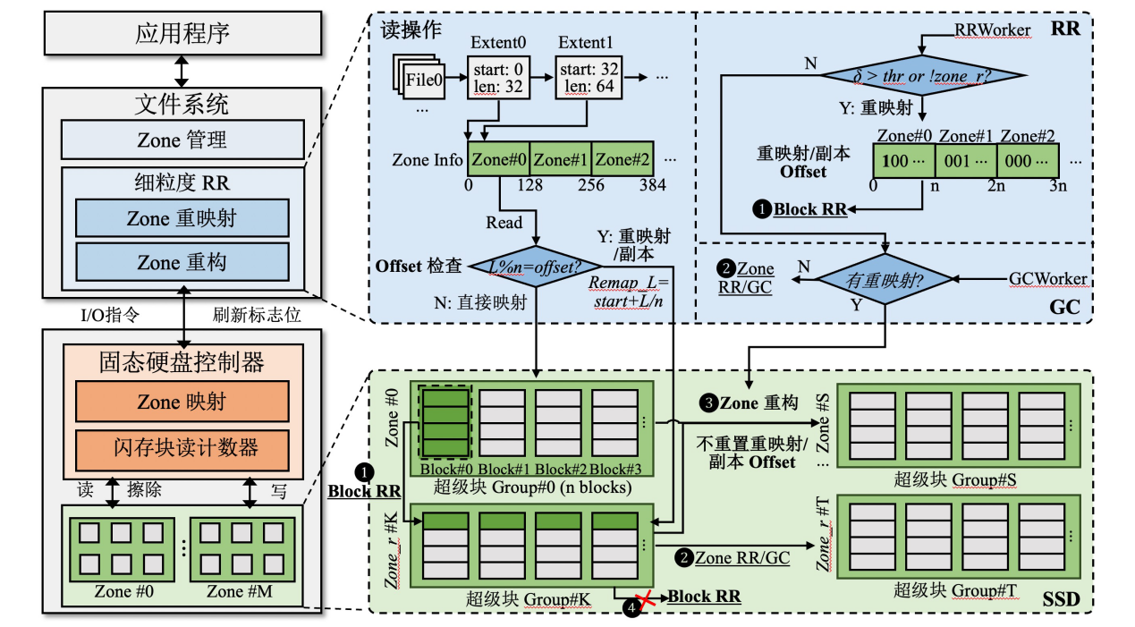 该研究针对分区命名空间固态硬盘(ZNS SSD)中区域级读刷新机制导致的数据迁移开销过大的问题,提出了一种细粒度读刷新机制FineRR-ZNS。该方案采用主机控制的块级选择性刷新策略,通过元数据重映射技术实现精准刷新区块定位,并设计了区域重构方法,在确保数据完整性的同时优先访问重映射数据,直至对应数据块需要再次刷新。实验结果表明,该机制可平均提升I/O吞吐率28.2%,同时提高41.8%的存储空间利用率。