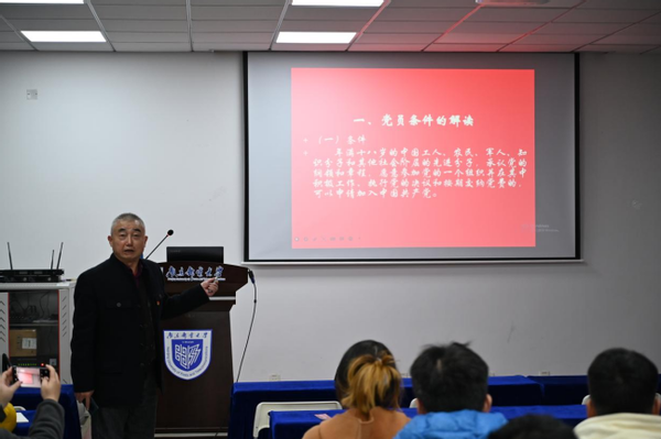 党课上,储成祥老师以“牢记党员条件 争做学生中的先锋模范”为主题,与学员一起讨论交流了发展党员的要求、党员义务权利关系、如何争做先锋模范等三方面内容。通过此次党课,培训班的学员们了解了入党条件,端正了入党动机,更加坚定了自身政治立场与理想信念,加快了向党组织靠拢的步伐。