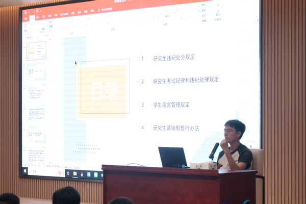 随后张龙老师逐一讲解了研究生违纪处分规定、研究生考试纪律和违纪处理规定等相关规定,结合典型案例强调学术诚信与考试纪律的重要性。在宿舍管理方面,他详细说明调换宿舍、退宿、校外住宿等流程的规范性,明确卫生标准及水电费缴纳要求,着重强调“严禁在宿舍内、楼道、教研室等公共场所抽烟”的硬性规定。针对请销假制度,他明确指出 “外出不归宿需提交请假条,经导师与辅导员双重签字同意”的要求,提醒新生强化规则意识。