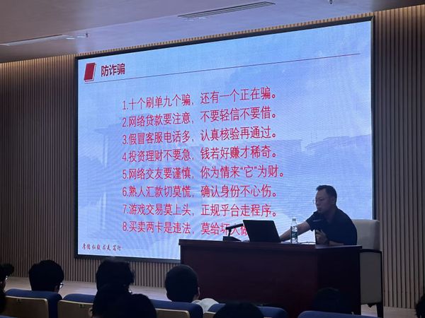 讲座伊始,吴学政处长结合多年校园安全管理经验与典型案例,围绕防诈骗、消防安全、交通安全三大核心板块展开深度讲解。在防诈骗板块,他结合“十个刷单九个骗,还有一个正在骗”“网络贷款要注意,不要轻信不要借”等常见诈骗类型,用生动的讲述揭示各类诈骗手段的真相,细致拆解诈骗套路逻辑。他着重提醒,涉及资金往来务必高度警惕,这是防范诈骗的关键,同时建议同学们尽早下载国家反诈中心APP,提升防范意识。