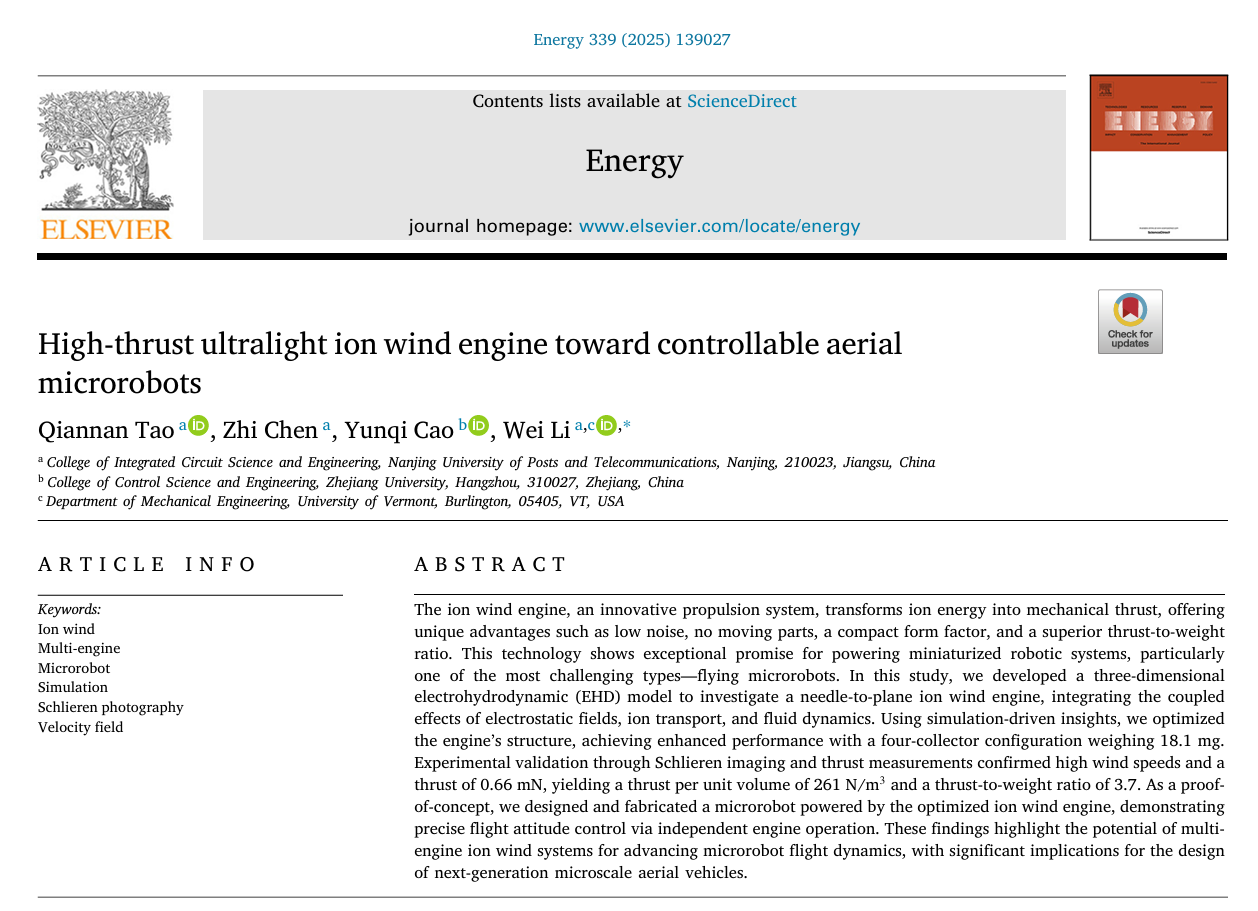 近日,69书吧 智能微机电系统团队在微型飞行机器人领域取得重要突破,其研究成果《High-thrust ultralight ion wind engine toward controllable aerial microrobots》正式发表于能源领域国际权威期刊《Energy》(中科院一区TOP期刊,2025年影响因子:9.4)。该论文第一作者为69书吧 青年教师陶倩楠,研究生陈挚为联合作者,通讯作者为李巍教授。