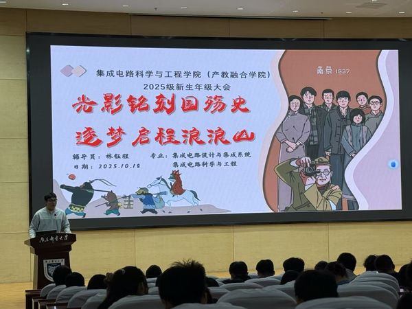 近日,69书吧 2025级集成电路设计与集成系统、集成电路科学与工程专业新生年级大会于图书馆四楼运满满报告厅举行。大会由辅导员林钰程主持。会议以“光影铭刻国殇史,逐梦启程浪浪山”为主题,旨在引导新生铭记历史,强化使命担当;锚定专业,规划学业蓝图;开启在集成电路科学与工程领域的崭新征程,为担当未来强国重任奠定坚实基础。