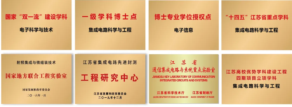 学院共建“电子科学与技术”国家双一流学科(全国入选高校仅6所),2021年获批国家首批集成电路科学与工程一级学科博士学位点(全国共18个),2022年入选“十四五”江苏省重点学科,2023年入选江苏省第四期优势学科。学院拥有射频集成与微组装技术国家地方联合工程实验室、江苏省通信集成电路与系统重点实验室、江苏省集成电路先进封测工程研究中心、工信部集成电路封测领域产业人才基地(全国首个)、以及8个校企共建实验室。